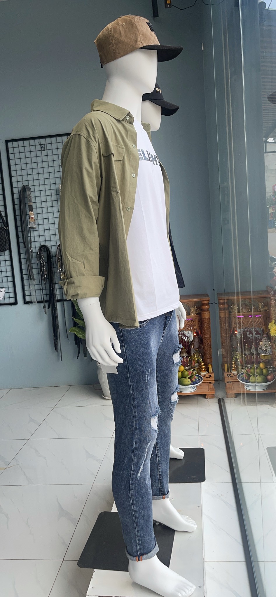 Dễ dàng phối phụ kiện: Chủ shop có thể linh hoạt phối thêm nón, kính mát hay tai nghe cho manocanh đầu trứng để tạo nên một concept phong cách sống sống động cho showroom.